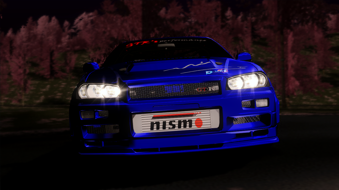 Inspiration of the car: Mine's, Johnny's The Blue Dragon R34, Nismo R/S/Z-tune, Abflug R34 from TXR Zero intro, HKS, Signal Auto.